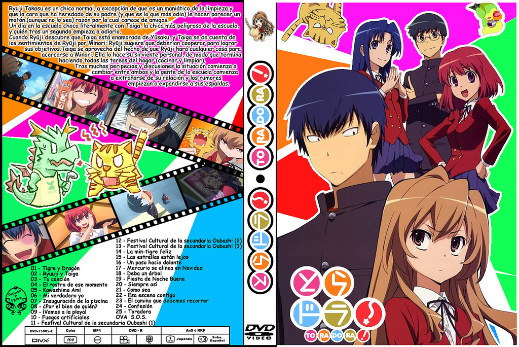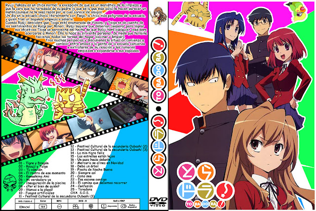 Toradora [25/25] – Avi – Mega – La historia de Toradora! gira en torno a Ryuji Takasu un chico normal, a excepción de que carecede amigos, dado que tiene cara de ser un chico rebelde, cosa que no es XD, un dia se choca literalmente con Taiga quien en un segundo empieza a odiarlo. Taiga lo trata como sirviente, y se muda justo al lado de su casa para que haga los labores hogareños, justo es esta situación la que deja ver que verdaderamente Ryuji no es un delicuente como muchos piensan. Ambos acuerdan en ayudarse mutuamente para cambiar la perspectiva que los demás tienen de ellos, y la relación que comienza entre ambos se empieza a divulgar entre su escuela